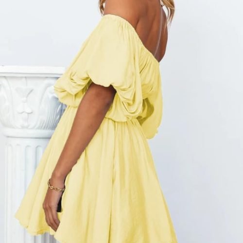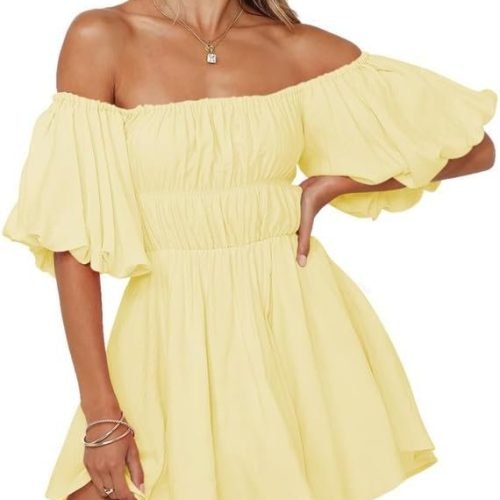 Womens Off The Shoulder Summer Dresses 2024 Short Lantern Sleeve Ruffle Elastic Waist A-Line Casual Mini Dress