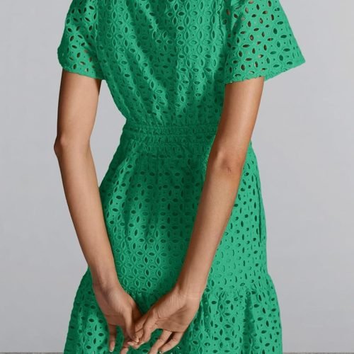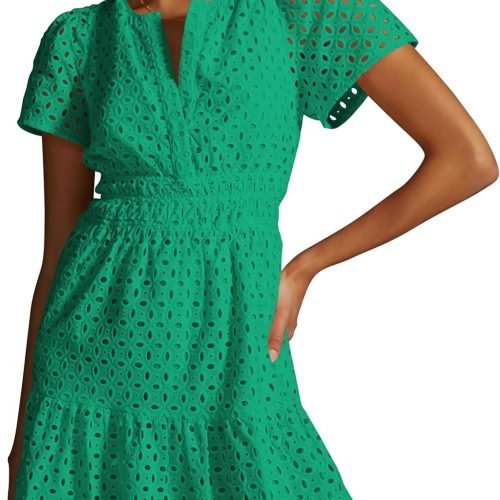 Womens 2024 Summer Short Dress V Neck Short Sleeve A Line Hollow Out Lace Ruffle Cute Casual Beach Party Dresses
