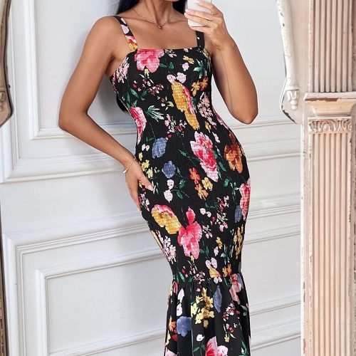 Womens Floral Summer One Shoulder Strappy Tiered Ruffle Midi Bodycon Dresses