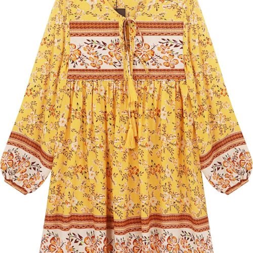 Womens Long Sleeve Floral Casual Print Cotton Mini Tunic Dress
