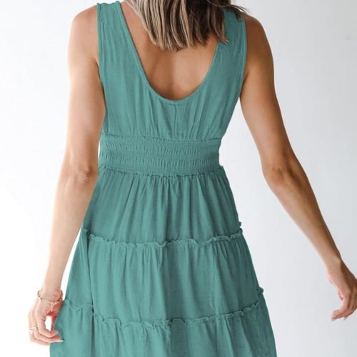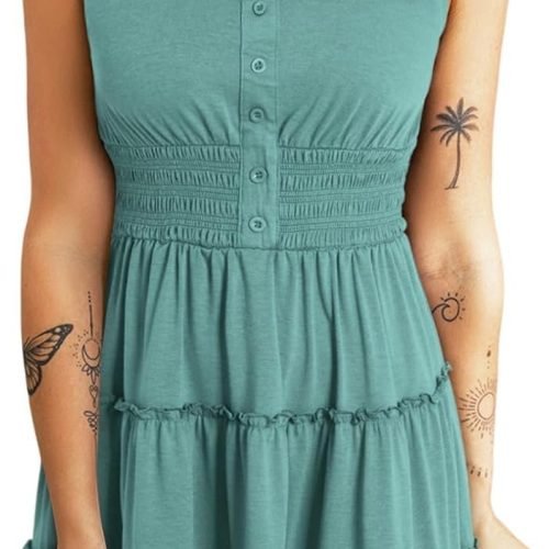 Womens Summer Dresses 2024 Sleeveless Button Down Smocked Elastic Waist Ruffle Tiered Casual Swing Mini Dress