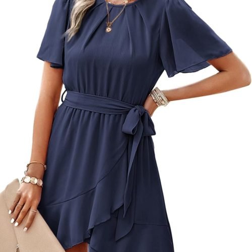 Womens Summer Dresses 2024 Crewneck Short Sleeve Waist Tie Ruffle Casual Chiffon A-Line Swing Mini Dress