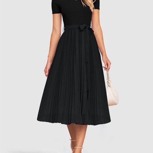 Womens Summer Short Sleeve Midi Dresses Spring Casual Crew Neck Knit Belted Pleated A Line Flowy Wedding Guest Dress