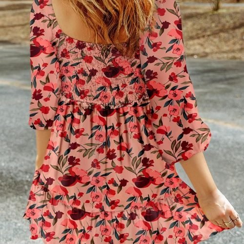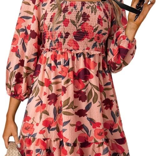 Womens Summer Dresses 2024 Boho Floral Square Neck Smocked 3/4 Sleeve Casual A-Line Swing Mini Babydoll Dress