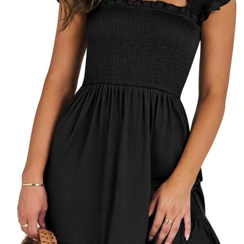 Womens Summer Casual Sleeveless Square Neck Smocked Ruffle Backless Boho Mini Dress 2024 Trendy Short Sundress