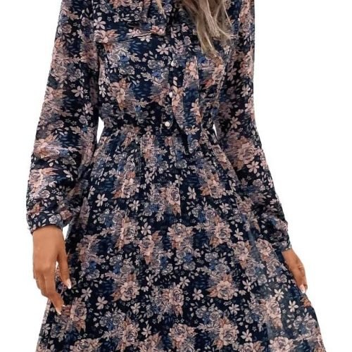 Womens V Neck Flowy Ruffle Pleated Casual Fall Dress