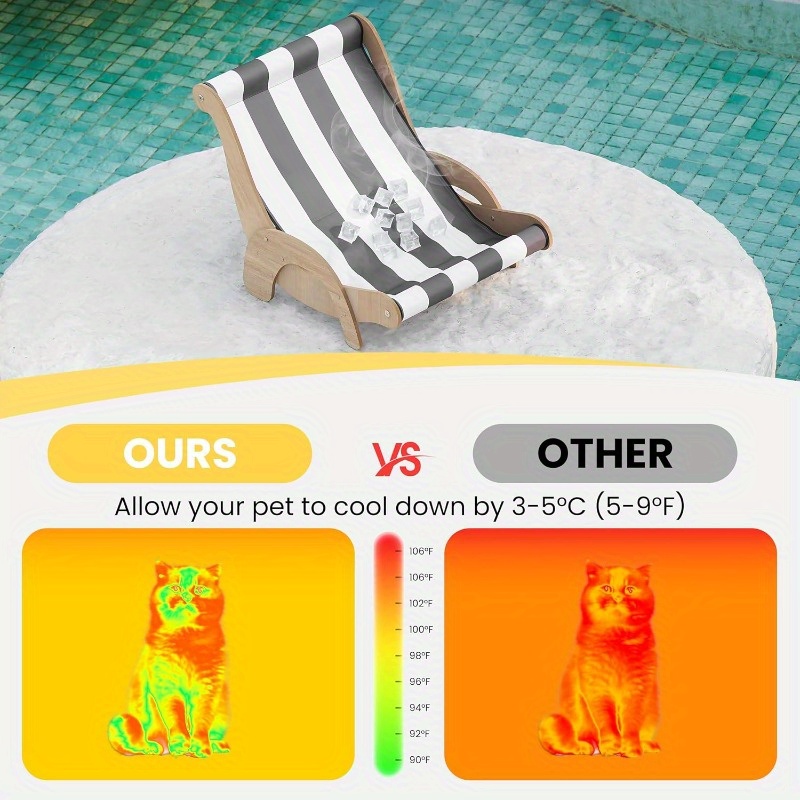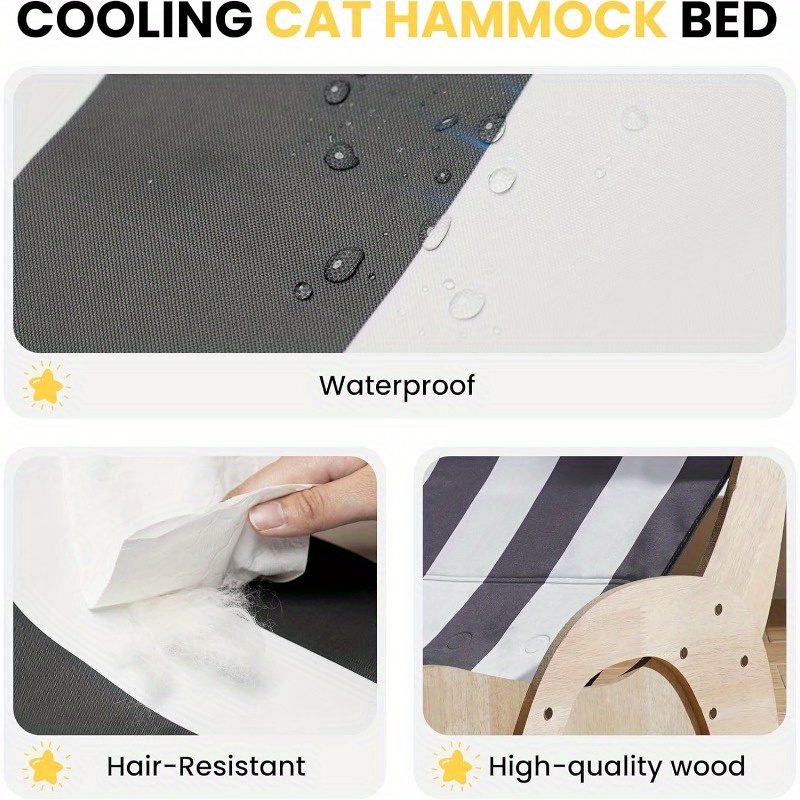 [BEACH STYLE DESIGN]Inspired by classic beach chairs, this outdoor cat bed is both stylish and comfortable. It’s perfect for cats who love to bask in the sun, providing a cozy, relaxing place that’s like a mini sunlounger. [COOLING CAT HAMMOCK CHAIR]The water-fillable cat cooling mat provides a refreshing cooling effect, perfect for hot weather. This pet cooling mat helps your cat stay comfortable and relaxed, even on warm summer days. [ELEVATED DESIGN]This outdoor cat bed feat