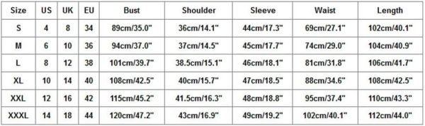 Size: XXL US: 12 UK: 16 EU: 42 Bust: 115cm/45.2″” Shoulder: 41.5cm/16.3″” Sleeve: 48cm/18.8″” Waist: 95cm/37.4″” Length: 110cm/43.3″”