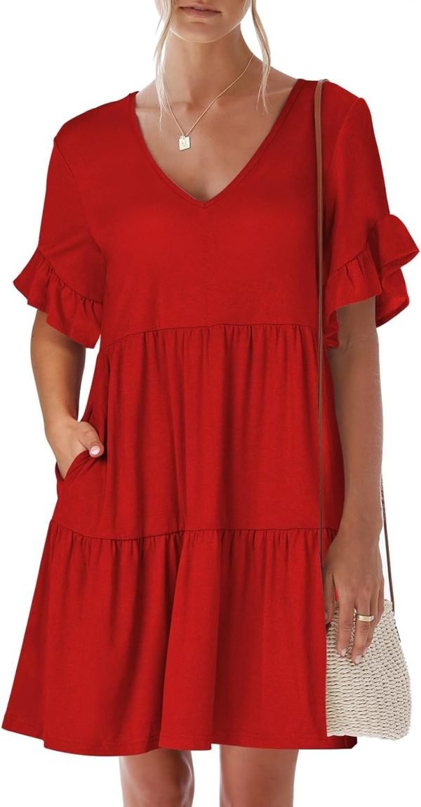 Catalogl V Neck Ruffle Short Sleeve A Line Tiered Summer Mini Dress for Women