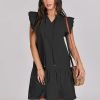 Womens Summer V-Neck Drawstring Ruffle Cap Short Sleeve Casual Shift Mini Dress with Pockets