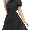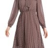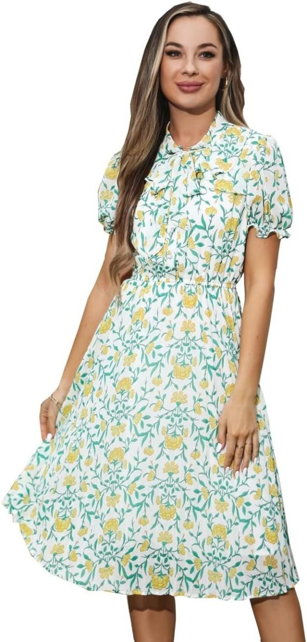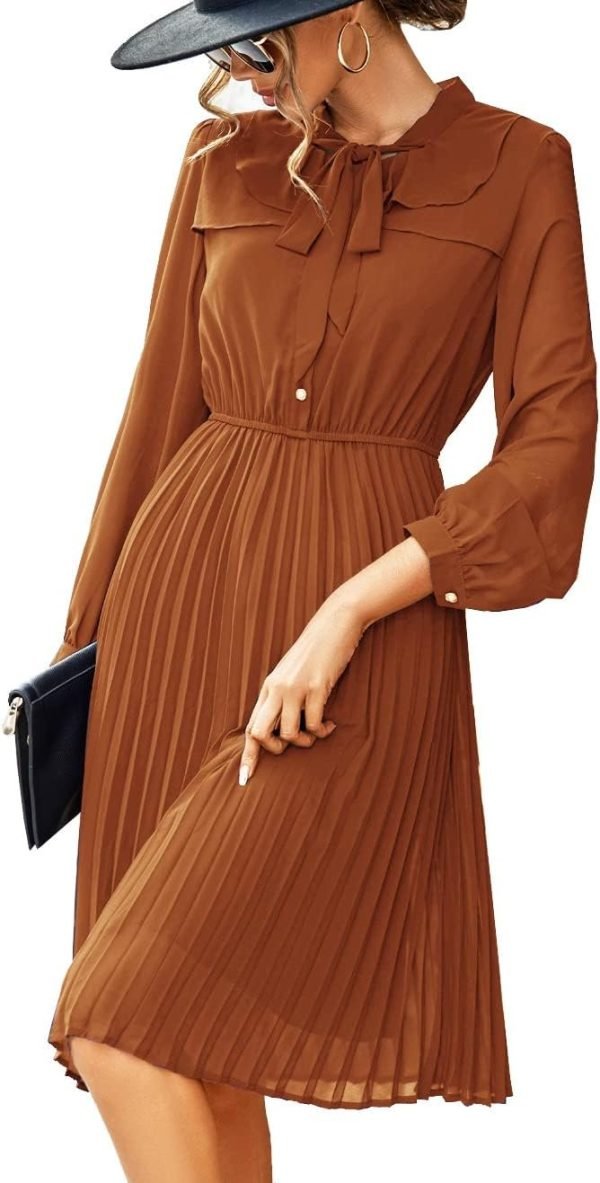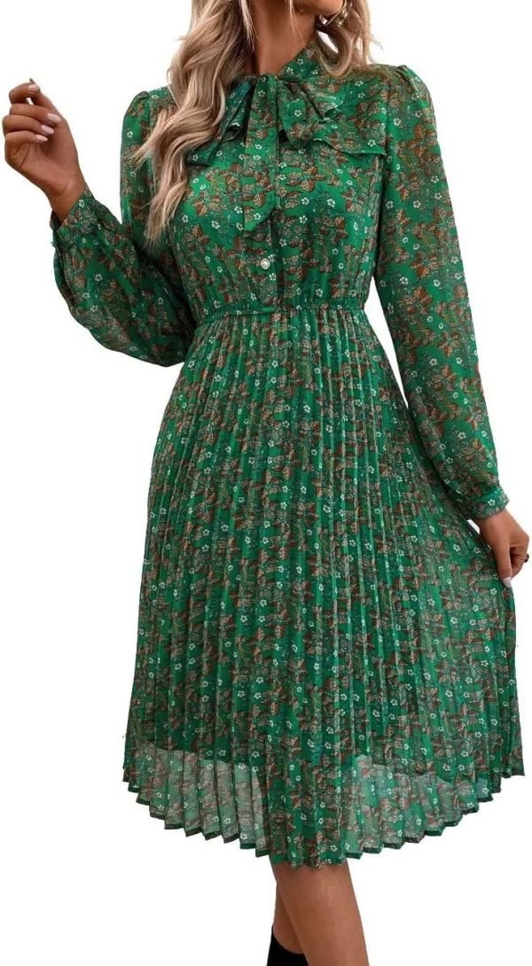 Catalogl Women Elegant Flare Bow Tie Neckd Pleated Loose Print Chiffon Dress