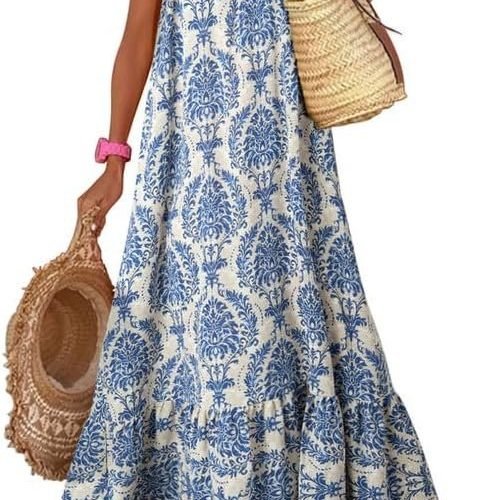 Women Summer Dresses 2024 Spaghetti Strap Scoop Neck Smocked Ruffle Flowy Boho Maxi Dress