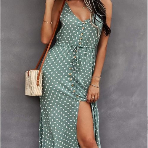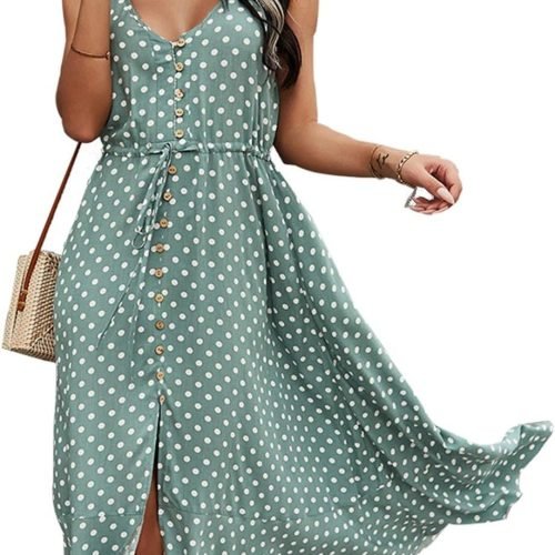 Women’s 2024 Summer Casual Boho Sundress Polka Dot Spaghetti Strap V Neck Flowy Midi Dresses