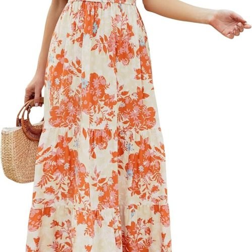 Women’s 2024 Summer Casual Floral Print Short Flutter Sleeve Crew Neck Smocked High Waist Flowy Maxi Dress