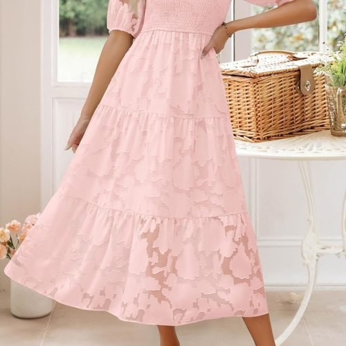 Women’s 2024 Summer Puff Sleeve Smocked Floral Dress Crewneck Lace Flowy Tiered Midi Dresses