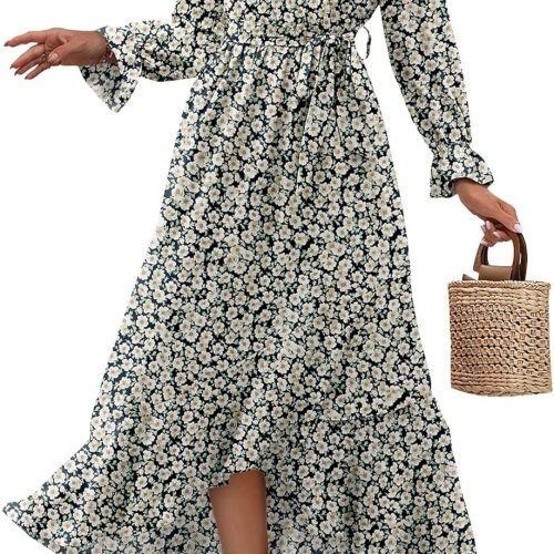 Women Long Sleeve Wrap Maxi Dress V Neck Boho Floral High Waist Flowy Ruffle 2024 Spring Summer Dresses with Belt